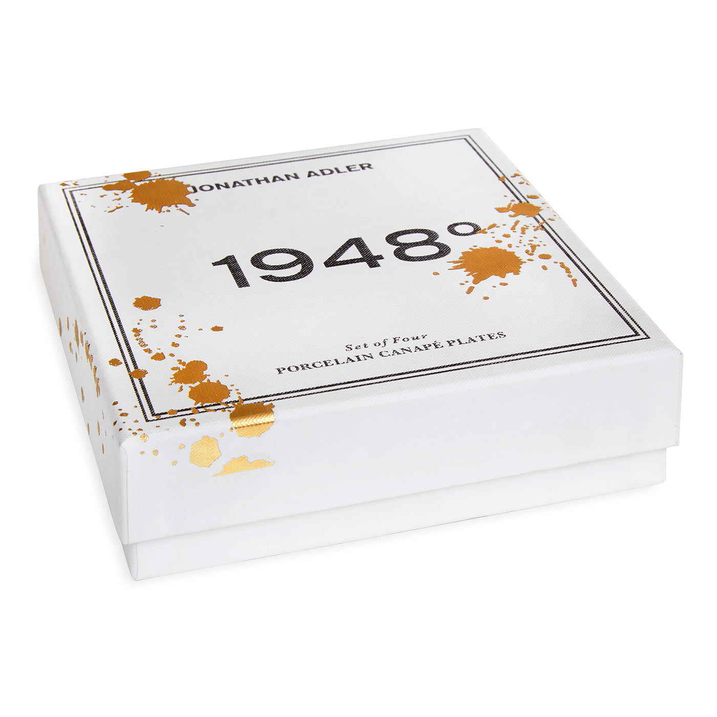 Named for the temperature at which gold melts, our 1948 collection features classic porcelain dinner and serveware splattered with real gold: the perfect balance of timeless and today, formal and fresh, uptown and downtown. Gilded and giftable in luxe packaging, our 1948 Canapé Plate Set is perfect for parties, desserts, or diminutive snacks. Formal enough for a fabulous fête, but hardworking for use as an everyday luxury.
