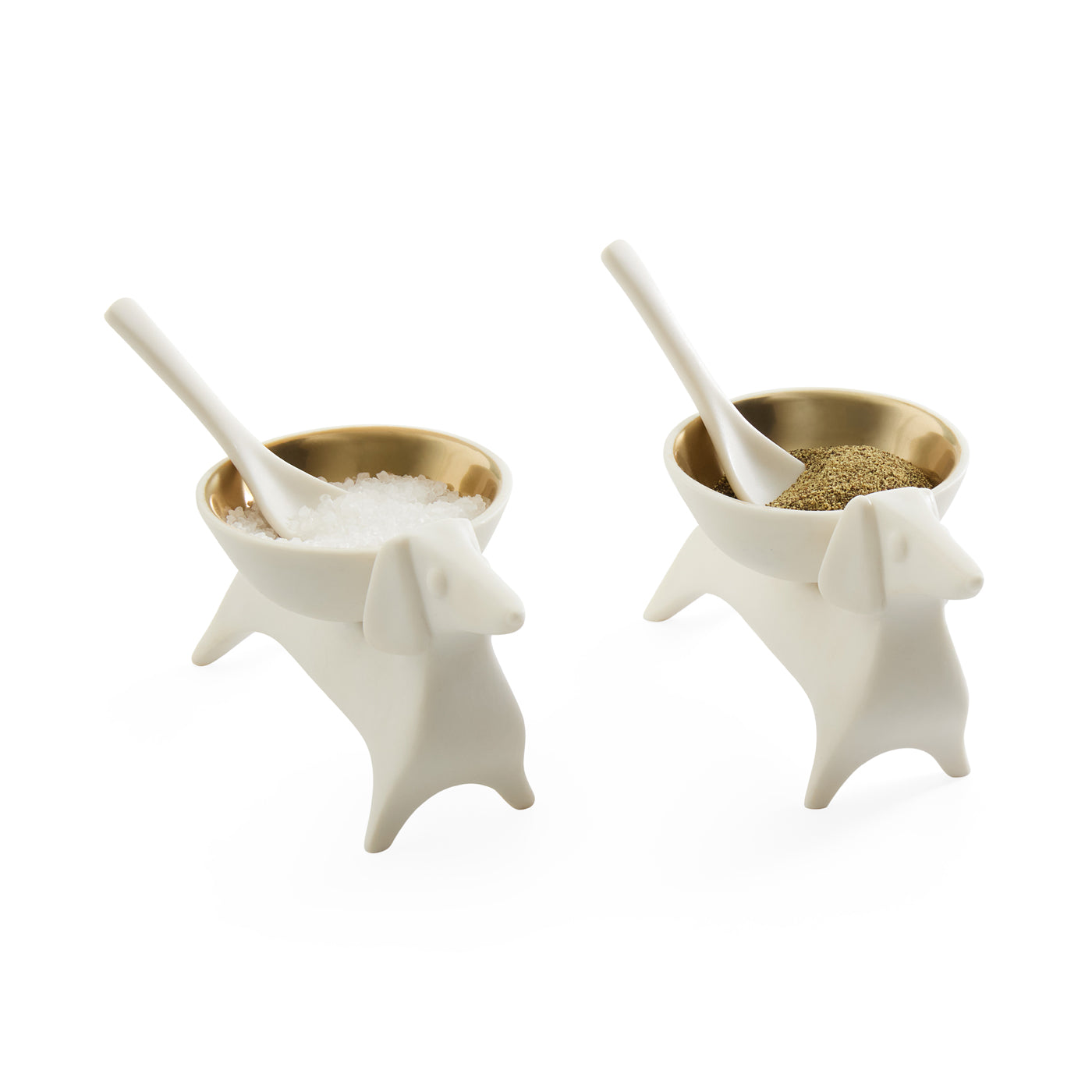 A hand-sculpted homage to one of our favorite pups, our Dachshund Salt & Pepper Cellars are a charming spot for your favorite seasonings. Featuring our signature dachshunds crafted from matte porcelain with glimmering gold interiors. Set includes two matte porcelain spoons.