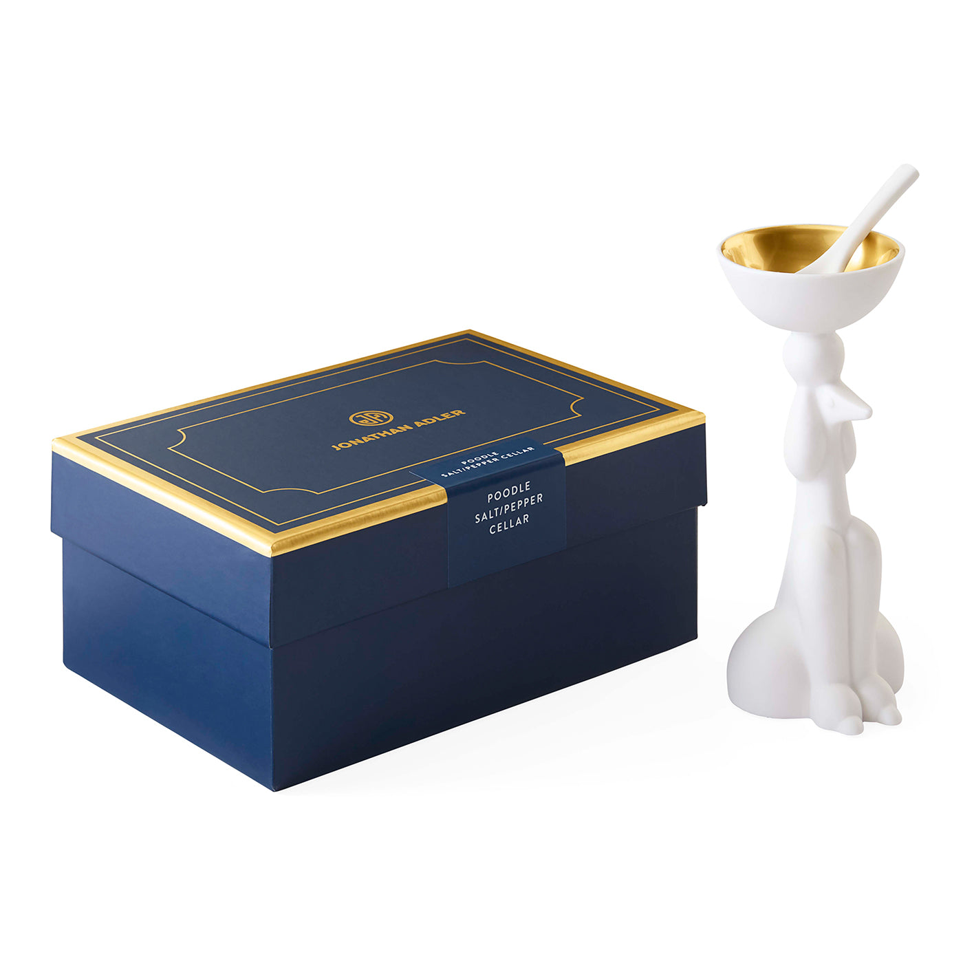 A hand-sculpted homage to one of our favorite pups, our Poodle Salt & Pepper Cellar is a charming spot for your favorite seasoning. Featuring our sculptural poodle form crafted from matte porcelain with a glimmering gold bowl. Sold individually with a single matte porcelain spoon for mixing and matching with our other preferred pooches: Greyhound, Basset Hound, and French Bulldog cellars.