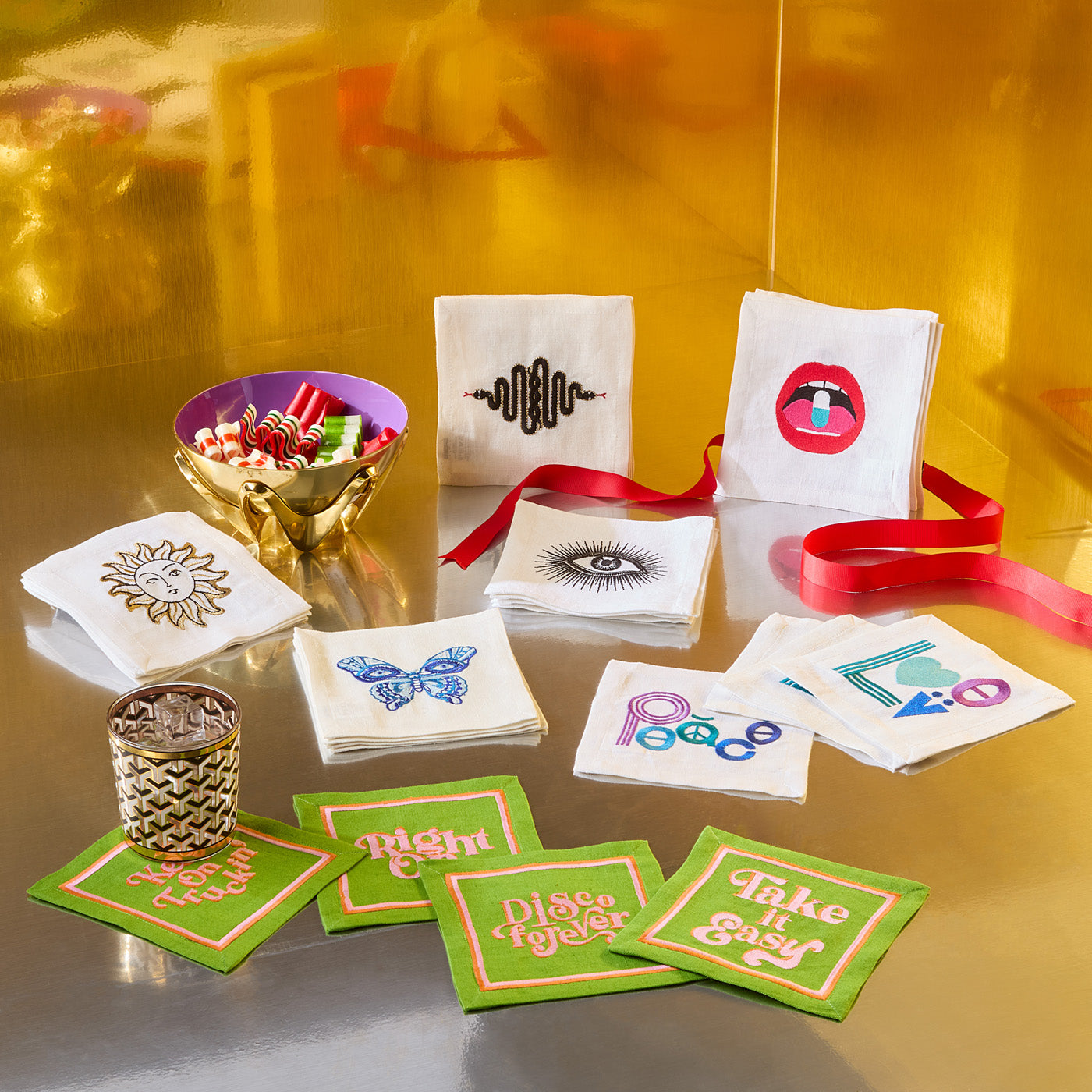 The perfect pairing with cocktails and canapés, these beauties even elevate basic bar nuts. Embroidered on luxe linen, our bold red lips are the kiss of hedonistic glamour your evening deserves.
